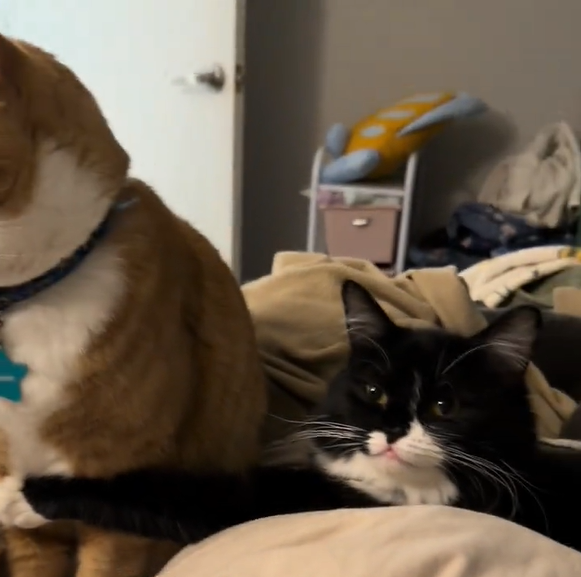 主人看着这幕,笑到不行,炸鸡差点喷出来,橘猫则是一脸委屈:明明是我先看到的……